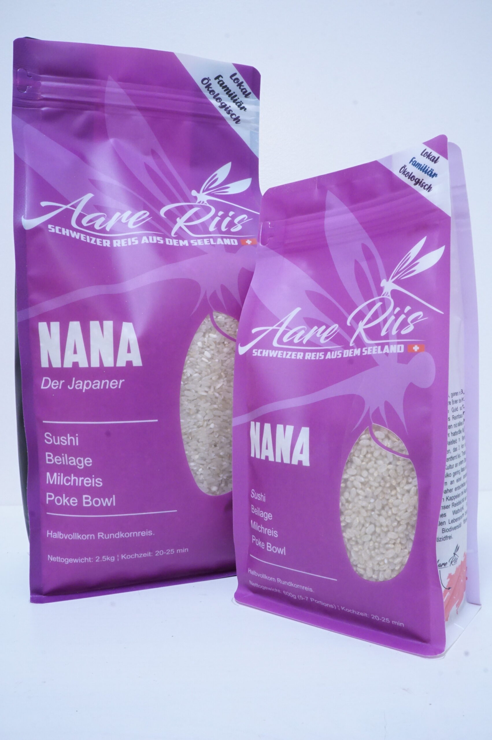 Schweizer Halbvollkorn Rundkornreis. Sorte 'Nana'. Geeignet für Sushi, Beilage, Milchreis, Poke Bowl. Nach dem Kochen entfaltet sein rundes Korn ein feines Aroma mit einer gewissen Süsse. Die Textur ist leicht klebrig. Der gekochte Reis kann warm oder kalt gegessen werden. Kochzeit: 20-25 min
